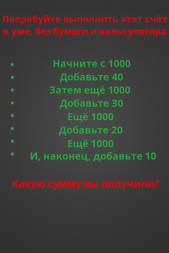 Откуда ошибка? Здесь проявляется эффект умственной перегрузки и стремления мозга к быстроте. Сталкиваясь с последовательностью чисел, мы «схватываем» крупные блоки (четыре раза по 1000) и как бы теряем из фокуса мелкие прибавки между ними. Внутренний автопилот подсказывает: «четыре тысячи… примерно пять», — и мы выдаём быстрый, но неверный итог. На деле же: 1000×4 = 4000, а 40+30+20+10 = 100; 4000 + 100 = 4100.