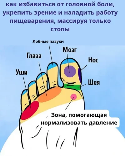 • Кончики пальцев стопы — связаны с лобными и гайморовыми пазухами, помогают при насморке и головных болях.