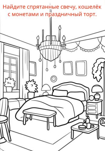 Освещение — душа спальни. Люстра дарит мягкий рассеянный свет и формирует общее настроение. Настольные лампы создают интимное, тёплое сияние для вечеров, а утренние лучи, проходящие через лёгкие шторы, делают комнату живой и просторной. Даже на раскраске попробуйте передать игру света и тени — это добавит глубины и реализма вашей задумке.