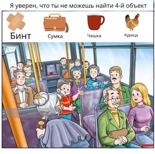 Представь себе утренний городской автобус, полный людей. Кто-то стоит, крепко держась за поручень, кто-то уткнулся в телефон или газету, ребёнок весело показывает на окно, комментируя пейзаж за стеклом. Казалось бы — самая обыденная сцена из повседневной жизни. Но есть одно «но»: среди десятков пассажиров художник ловко спрятал четыре необычных предмета — бинт, сумку, чашку и курицу. Сначала это кажется простой детской игрой, но стоит начать поиск — и глаза быстро начинают уставать от мельтешения деталей, а внимание ускользает от очевидного.