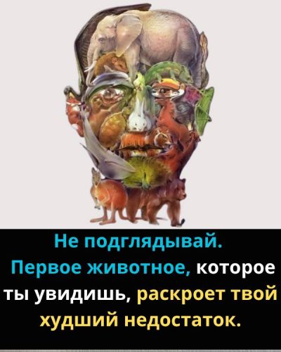 💡 На иллюстрации изображено лицо, сложенное из множества животных. То существо, которое вы заметили первым, символизирует вашу главную слабость.