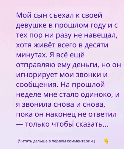 Когда мой сын в прошлом году решил съехаться со своей девушкой, я была уверена: начинается новый, светлый период его жизни. Они обосновались всего в нескольких минутах от меня — десять минут на машине, и я уже представляла себе регулярные семейные ужины, неспешные визиты на чай, смех за столом и ту крепкую связь, которой мы всегда дорожили.