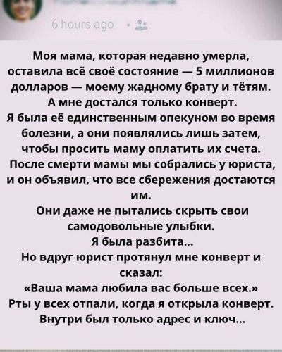 Когда моей мамы не стало, я узнала, что всё её состояние — 5 миллионов долларов — она завещала моему алчному брату и двум тёткам. А мне, дочери, которая не отходила от её постели, достался только маленький конверт.