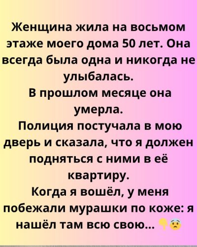 Когда в прошлом месяце её не стало, я был ошеломлён, увидев полицейских у своей двери. Они сообщили, что моё имя указано в её документах как экстренный контакт. Я не мог понять, почему — ведь между нами никогда не было близкого общения, только короткие приветствия в коридоре.