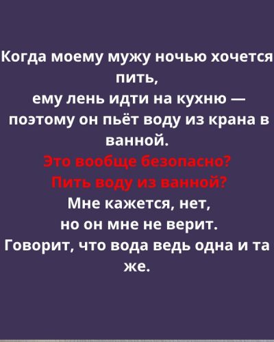 После этого случая я предложила простое решение — держать бутылку чистой воды у кровати. Теперь муж делает именно так. А ту ночь он запомнил надолго: сделал глоток из ванной, сморщился от металлического привкуса и, немного помедлив, признал с усмешкой: «Ладно, ты была права».