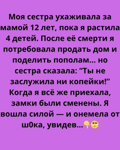 Моя сестра, ей 38 лет, действительно ухаживала за нашей матерью больше десяти лет — все 12 лет болезни она была рядом. Я же растила четырёх детей и не могла жить с мамой постоянно, хотя и помогала, когда могла. После того как мама умерла, я предложила сестре освободить дом, чтобы мы могли продать его и поделить вырученные деньги поровну. Но сестра заявила: «Ты не заслуживаешь ничего! Ты не была такой же преданной дочерью, как я!»