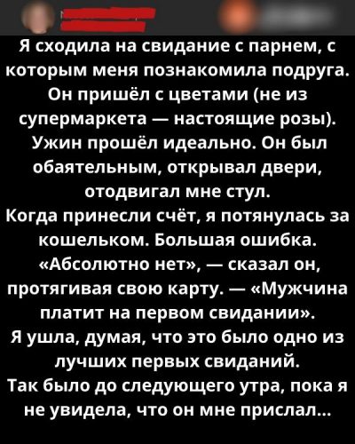 Когда Эрик с уверенностью заявил, что оплатит наш первый ужин, я искренне решила, что передо мной редкий представитель старой школы – вежливый, воспитанный мужчина. Розы, продуманный маленький презент, уважительная манера общения — всё складывалось идеально. А на следующее утро я открыла телефон в ожидании тёплого послесвиданийного сообщения… и буквально похолодела, увидев то, что он прислал.