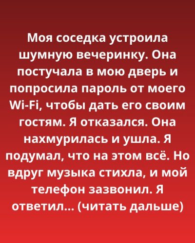Соседка искренне извинилась — и за то, что побеспокоила просьбой о пароле, и за громкое веселье. Она сказала, что они решили завершить праздник раньше — как жест уважения ко мне и моему покою.