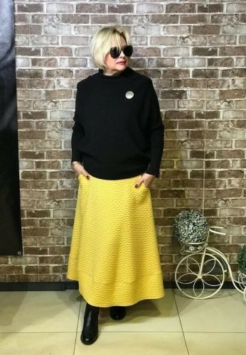 Яркая фактурная юбка-макси становится центральным элементом образа. Чёрный свитер с широким воротом и ботильоны уравновешивают насыщенность цвета и создают гармоничный и уверенный стиль.