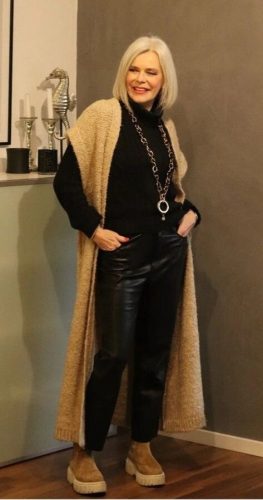 Чёрные кожаные брюки прямого кроя и тёплый шерстяной свитер с высоким горлом выглядят лаконично, но длинный жилет золотисто-бежевого цвета освежает образ. Замшевое обувь на массивной подошве идеально подчёркивает характер ансамбля.