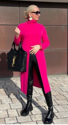 Ярко-розовый свитер насыщенного оттенка с высоким воротом и асимметричным вырезом делает акцент на индивидуальности. В сочетании с узкими чёрными кожаными брюками и высокими сапогами получается смелый, но гармоничный образ без лишней провокации.