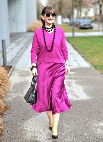 Лиловая шёлковая юбка-солнце прекрасно сочетается с джемпером схожего оттенка и крупным чёрным ожерельем. Классические чёрные туфли и изящная сумочка завершают образ.