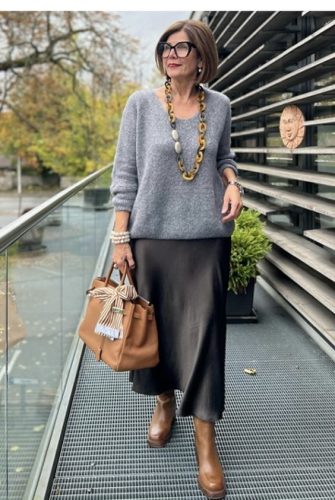 Шёлковая миди-юбка в тёмно-серой палитре вместе со светло-серым джемпером с V-образным вырезом создают элегантный и мягкий образ. Коричневая сумка и ботинки челси добавляют глубины, а массивное украшение на шее завершает модный акцент.