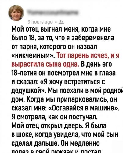 Ни объятий, ни попытки остановить, ни последнего слова — только приглушённый щелчок выключенного света позади меня. С небольшой сумкой в руках и ребёнком внутри, я впервые поняла, как одного мгновения достаточно, чтобы лишиться всего, что считала надежным. И через восемнадцать лет именно этот ребёнок — уже юноша — появится на том же самом пороге с фразой, которая останется в памяти моего отца навсегда.