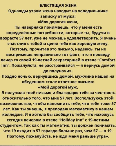 Поэтому, прочитав это письмо, надеюсь, ты не будешь неправильно воспринимать тот факт, что сегодняшний вечер я проведу со своей 19-летней секретаршей в отеле Comfort Inn.