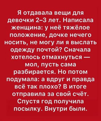 После этого я устроилась работать в школу, мы с дочкой сняли комнату, потихоньку выбрались из той ямы. Даша подросла, и теперь её вещи мы отдаем другим семьям. Я очень хотела, чтобы вы знали: ваше добро не растворилось в пустоте.