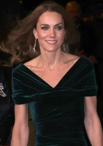 Совсем недавно, принцесса Уэльская появилась на благотворительном мероприятии в сопровождении своего супруга, принца Уильяма. Для этого выхода в свет Кейт выбрала бархатное платье насыщенного тёмно-зелёного оттенка.