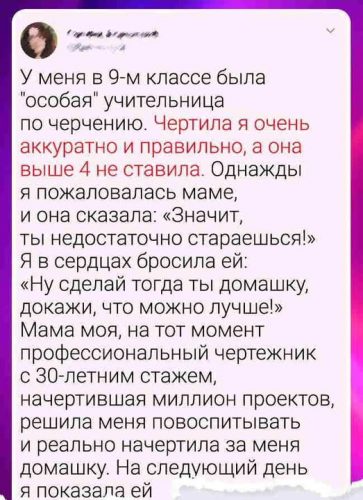 Это бесило. В какой-то момент я даже решила, что она относится ко мне предвзято. А когда получила очередную «четвёрку» за работу, которая, по моему мнению, была идеальна, не выдержала и пожаловалась маме.