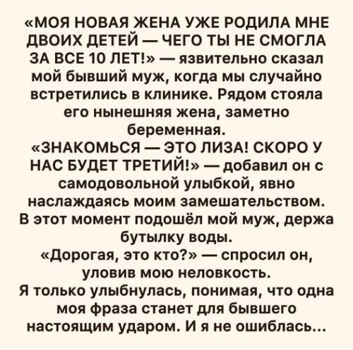 Когда я случайно столкнулась с бывшим мужем в коридоре частной клиники, он не удержался и произнес с ехидной усмешкой: «МОЯ НОВАЯ ЖЕНА УЖЕ ПОДАРИЛА МНЕ ДВОИХ СЫНОВЕЙ — ТО, ЧЕГО ТЫ ТАК И НЕ СДЕЛАЛА ЗА ДЕСЯТЬ ЛЕТ!» Рядом с ним стояла его молодая супруга — ухоженная, с заметно округлившимся животом, вся в выражении победы. Он сжал её за плечо, будто намеренно повысив голос, добавил: «ЗНАКОМЬСЯ — ЭТО ЛИЗА! МЫ ЖДЁМ ТРЕТЬЕГО!» Моя кровь на мгновение прилила к лицу, но не от обиды, а скорее от странного осознания, что он так и не изменился. Всё тот же человек, для которого счастье измеряется количеством детей и вниманием окружающих.