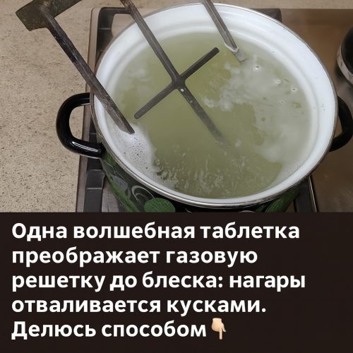 Сначала беру вместительную кастрюлю, в которую полностью помещается решётка. Наполняю её водой, ставлю нагреваться и запускаю две таблетки для посудомоечной машины. Когда жидкость начинает кипеть, аккуратно опускаю туда решётку и оставляю вариться около получаса.