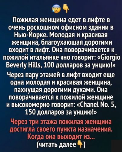 Через пару этажей к ним присоединяется ещё одна молодая красавица — ухоженная, уверенная в себе, с ещё более насыщенным ароматом. Она тоже не упускает случая подчеркнуть своё превосходство: