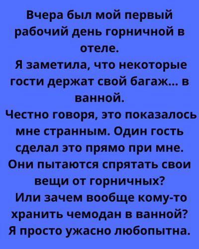 Поначалу я решила, что это простое совпадение. Возможно, кому-то так удобнее, а кто-то просто не хотел занимать место в комнате. Но чем больше номеров я убирала, тем отчетливее становилась закономерность. Даже если гости находились в номере, их багаж всё равно стоял в ванной.