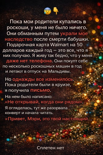 «Мэри, я твой настоящий отец. Я много лет пытался тебя найти. Твоя бабушка оставила тебе крупное наследство, и я боролся, чтобы вернуть его тебе. Встреться со мной по адресу, указанному внутри. Пришло время забрать то, что по праву принадлежит тебе, и наконец изменить свою жизнь».