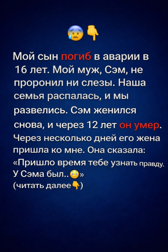 Мы сидели рядом в тишине, и лишь спустя несколько минут она решилась рассказать то, что он носил в себе все эти годы. По её словам, Сэм безмерно любил нашего сына, а его смерть сломала его куда сильнее, чем кто-либо мог предположить. То самое внешнее спокойствие, которое я принимала за холодность, на самом деле было его способом выжить. Если бы он дал волю чувствам, он просто не выдержал бы.