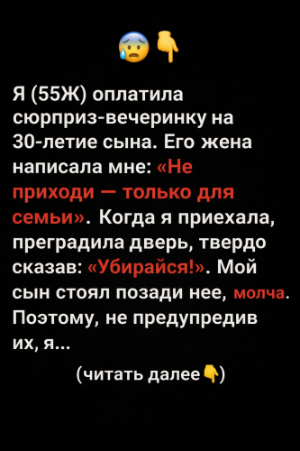 Мне 55 лет, и я — мама. Именно я оплатила сюрприз-вечеринку к 30-летию своего сына: ресторан, отдельный зал, ужин, всё до мелочей. Но за несколько дней до праздника его жена написала мне короткое сообщение: