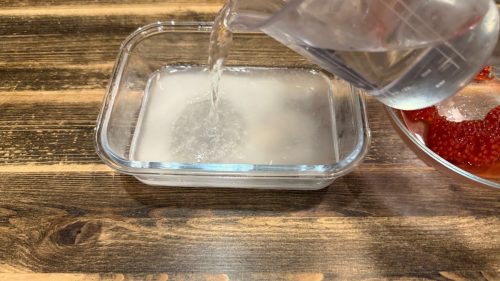 Берём ложку или вилку и перемешиваем, пока соль почти полностью не растворится. Пока мы это делаем, температура воды немного снижается и становится оптимальной для икры — около 45–50°C.