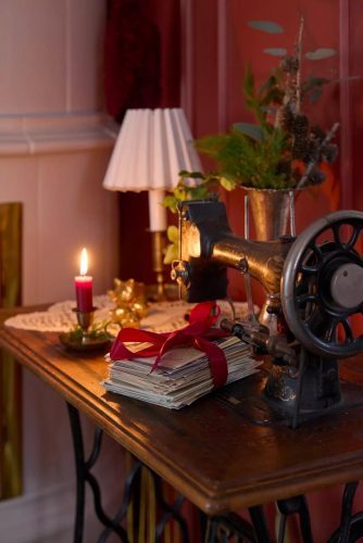 Лестничная площадка второго этажа обладает особым шармом. Малиновый диван 1930-х годов, американский дорожный сундук начала XX века, старый ковёр из родительского дома. Мягкий свет и свечи подчёркивают ощущение времени, а небольшие декоративные детали добавляют праздничное настроение.