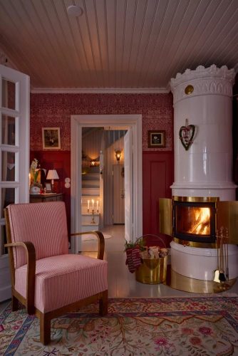 Изразцовая печь выглядит старинной, но на самом деле она новая — её установили в 2025 году, заменив прежнюю, пришедшую в негодность. А красные обои в гостиной — от Morris & Co.