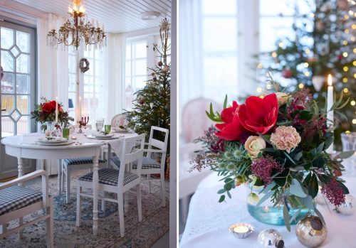 На подоконниках — композиции из цветов, гирлянд и старинных фарфоровых фигурок.