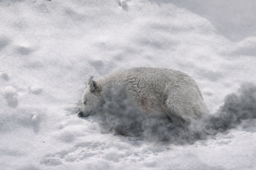 Женщина нашла его лежащим во дворе. Он лежал прямо на снегу, замерзший, истекший …., которой потерял слишком много. На фото вокруг него и на лапах был красный снег. Снежок с трудом поднялся на лапы, за ним тянулся кровавый след, из носа тоже шла красная жидкость. Сначала все подумали, что он попал под машину, — повреждений было слишком много. Истинная причина оставалась неизвестной, возможно, никто её так и не узнает.