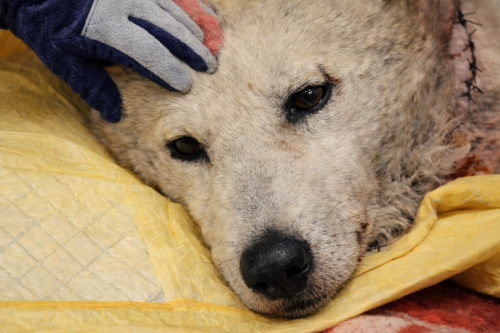 В клинику мы привезли почти истощенную собаку: температура тела была ниже 37 градусов. Постепенно его согрели, подняли давление и пульс.