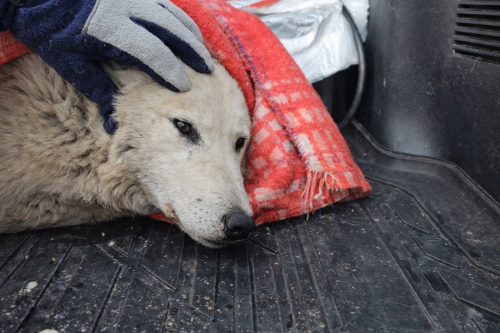 Все лапы были в кровs, и когда пес повернул голову, стало видно глубокое повреждение на шее, откуда тянулся кровавый след. Мы накрыли его одеялом — он не сопротивлялся, лишь тяжело и часто дышал. Ему было холодно, больно, организм терял жидкость.