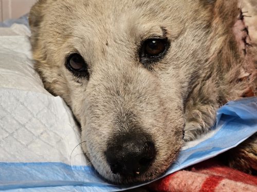 Все лапы были в крови, и когда пес повернул голову, стало видно глубокое повреждение на шее, откуда тянулся кровавый след. Мы накрыли его одеялом — он не сопротивлялся, лишь тяжело и часто дышал. Ему было холодно, больно, организм терял жидкость.