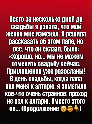 Когда настал день свадьбы, отец взял меня под руку и повёл вперёд. Почти сразу я ощутила тревогу: мы шли не туда, куда должны были. Вместо алтаря дорожка неожиданно свернула в сторону незнакомого прохода. По рядам гостей прокатился шёпот. Моё сердце билось так громко, что, казалось, его слышали все. Я смотрела на отца в поисках объяснений, но он шёл уверенно, его рука была спокойной и крепкой — будто обещала, что всё под контролем.