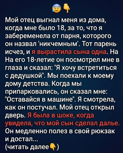 Не было ни объятий, ни прощальных слов — лишь тихий щелчок выключенного света за моей спиной. В руке — маленькая сумка, внутри — новая жизнь. В тот момент я поняла, как быстро можно лишиться всего, что считала опорой и безопасностью. Спустя восемнадцать лет тот самый порог переступит мой сын — с посланием, которое мой отец не смог бы забыть никогда.