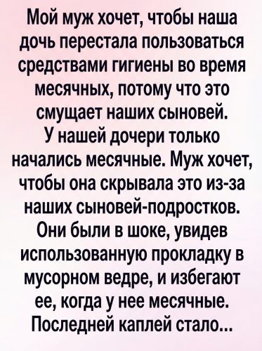 Кульминация произошла накануне вечером. Муж, не задумываясь, заявил, что во время менструации дочери лучше находиться в своей комнате — якобы братьям «неуютно» рядом с ней.