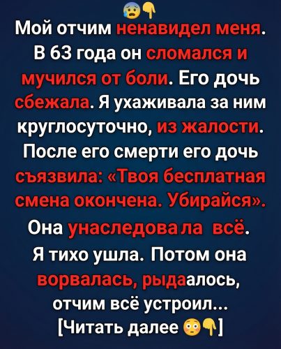 Здоровье отчима начало стремительно рушиться. Ещё недавно он уверенно отдавал распоряжения, а через неделю уже не мог стоять на ногах, дрожа от слабости. Врачи говорили шёпотом, бросая слова вроде «осложнения» и «ограниченное время». Дом, где раньше царили порядок и контроль, наполнился тревогой и страхом. Его родная дочь — та самая, настоящая — пообещала приехать и помочь.