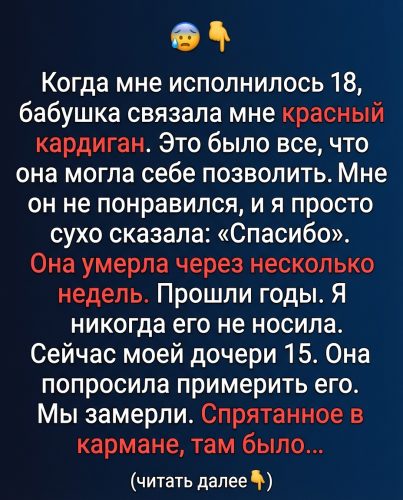 Когда мне исполнилось восемнадцать, бабушка вручила мне подарок — красный вязаный кардиган. Простой, недорогой, с завязками, сделанными вручную. Я улыбнулась и дежурно сказала: