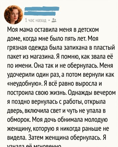 Я стояла, не двигаясь, пока рядом не опустилась женщина с очень добрыми глазами и тихо не сказала, что мне пора идти. Но я продолжала смотреть на закрытую дверь. Я была уверена: вот сейчас она распахнётся, мама вернётся — запыхавшаяся, испуганная, скажет, что всё это ошибка.