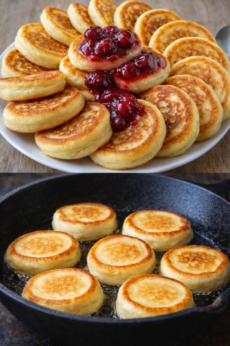 Чтобы оладьи получились действительно воздушными, важно хорошо их прожарить. Готовность лучше проверять деревянной шпажкой — она должна выходить сухой.