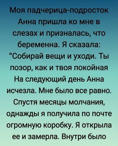 Однажды мне пришлось столкнуться с правдой о самой себе — правдой, скрытой за моими собственными жестокими словами. Всё началось в тот день, когда к моему дому доставили странную посылку. Тогда я ещё не знала, что она перевернёт мою жизнь окончательно и бесповоротно.