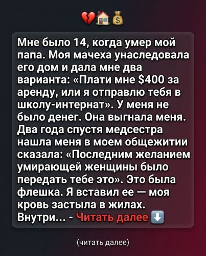 «Каждый месяц я откладывала деньги, которые делала вид, что требую с тебя. Дом продан в прошлом месяце. Долги полностью погашены. Теперь эти средства принадлежат тебе».