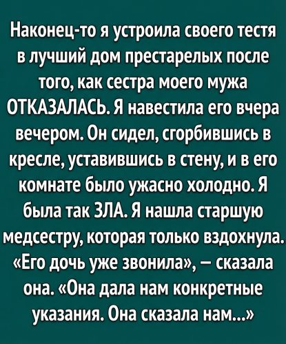 Это именно я смогла добиться для своего свёкра места в хорошем, достойном доме престарелых — после того как сестра моего покойного мужа категорически отказалась участвовать в его судьбе.