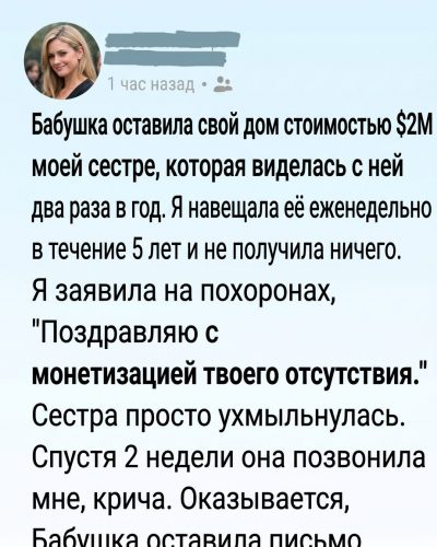 — Она оставила письмо, — продолжила Оливия, её голос дрожал от неверия. — В нём она всё объяснила. Она написала, что этот дом — не подарок. Это обуза. Он требует постоянных вложений и заботы. Он поглотит любого, кто не готов этим заниматься.