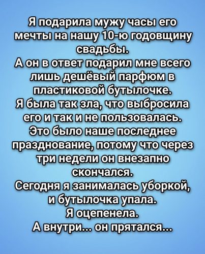 Десятилетие нашей свадьбы пронеслось почти незаметно, будто во сне. Я подарила ему часы — именно те, о которых он мечтал много лет. Внутри меня было волнение, в глазах — гордость за свой выбор. Он ответил своей привычной, слегка насмешливой улыбкой, но его подарок стал для меня холодным душем. Простой, дешёвый аромат в пластиковом флаконе — запах, который казался мне символом безразличия. В порыве раздражения я выбросила его, решив, что этот пустяковый подарок лишь подтверждает его жадность и неумение ценить мои усилия.