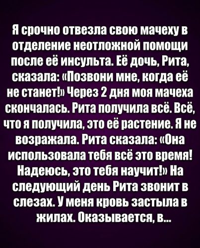 Эти слова больно ранили. Тогда я окончательно осознала: Рита никогда не воспринимала меня как родного человека. Для неё я всегда была лишней. Посторонней рядом с её матерью.